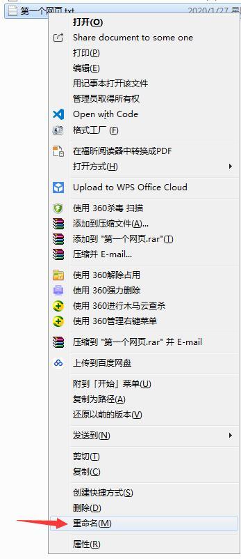 首先将光标放在"第一个网页.txt"文件上,点击右键,选择"重命名"。如图:
