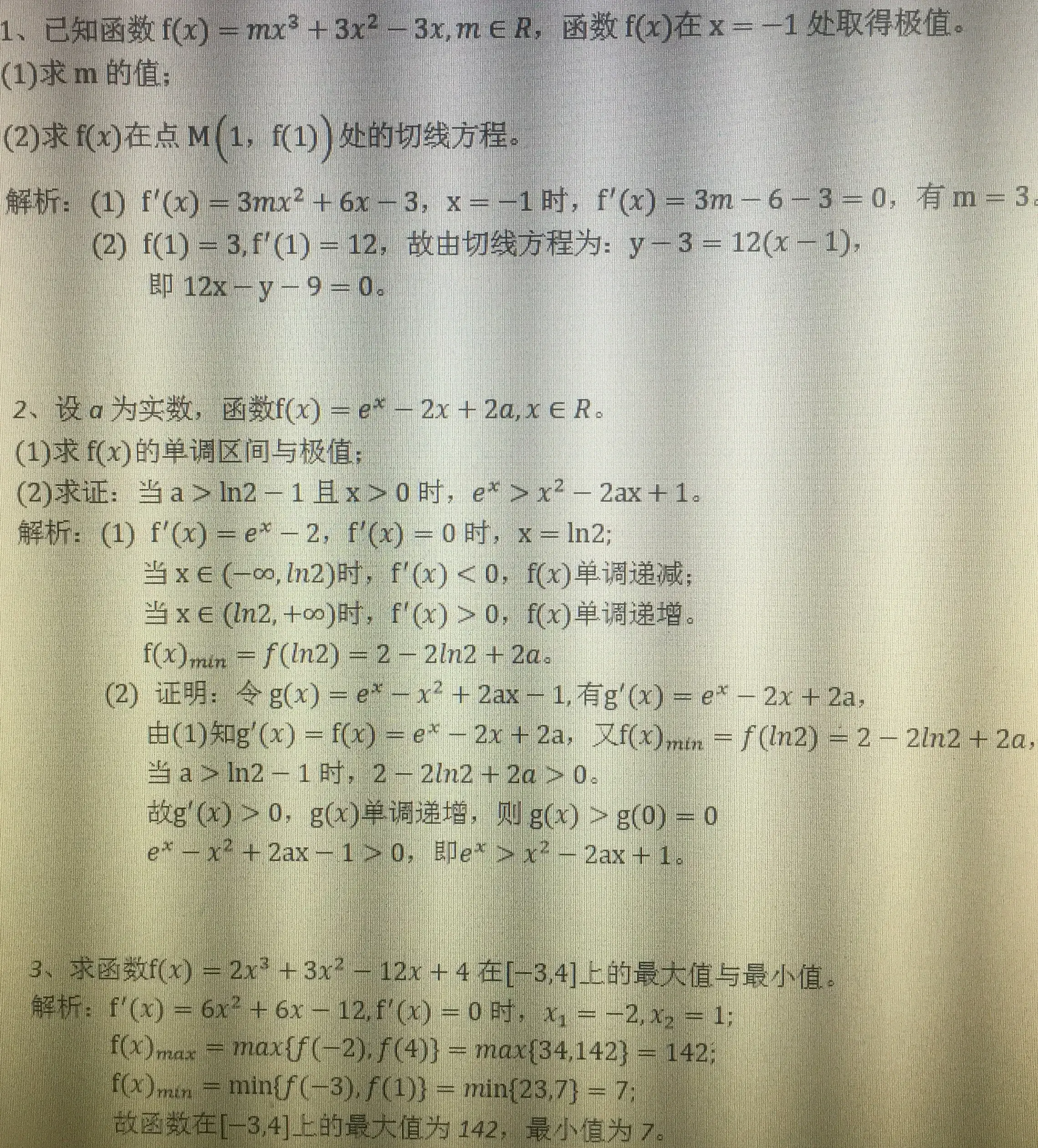 函数的极值的定义:若函数f(x)在x0的一个邻域D有定义,且对D中除x0的所有点,都有f(x) 同理,若对D的所有点,都有f(x)>f(x0),则称f(x0)是函数f(x)的一个极小值。 函数的最值:最小值即定义域中函数值的最小值,最大值即定义域中函数值的最大值。 ①函数的最值点必在函数的极值点或者区间的端点处取得。 ②函数的极值可以有多个,但最值只有一个。 1.利用导数证明不等式 2.根与零点问题 3.导数应用题八、导数的综合运用