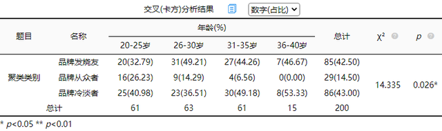 从上表可知,利用卡方检验(交叉分析)去研究年龄对于聚类类别共1项的差异关系,从上表可以看出:不同年龄样本对于聚类类别共1项呈现出显著性(p<0.05),意味着不同年龄样本对于聚类类别共1项均呈现出差异性,具体建议可结合括号内百分比进行差异对比。年龄对于聚类类别呈现出0.05水平显著性(chi=14.335, p=0.026<0.05),通过百分比对比差异可知,26-30岁选择品牌发烧友的比例49.21%,会明显高于平均水平42.50%。20-25岁选择品牌从众者的比例26.23%,会明显高于平均水平14.50%。36-40岁选择品牌冷淡者的比例53.33%,会明显高于平均水平43.00%。31-35岁选择品牌冷淡者的比例49.18%,会明显高于平均水平43.00%。可以根据数据结果进一步决策。也可以和“性别”、“学历”等进行交叉分析。这里不进行过多描述。