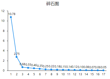 特征根一般是指标旋转前每个因子的贡献程度。此值的总和与项目数匹配,此值越大,代表因子贡献越大。当然因子分析通常需要综合自己的专业知识综合判断,即使是特征根值小于1,也一样可以提取因子。在进行因子分析时,研究者没有预设因子数,系统就会以特征根“大于1”为标准进行划分。因为此案例在分析前的预设因子个数为4所以也同样可以进行分析。除了特征根之外SPSSAU还提供了更加直观的碎石图帮助判断。
