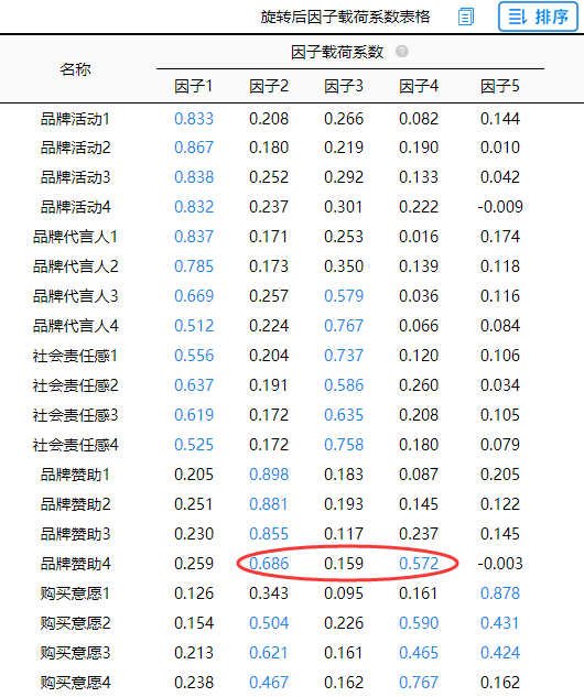 品牌代言人1-4共4项,它们全部对应着因子1,但是品牌代言人3、品牌代言人4同时又属于因子3,属于“纠缠不清”,暂不处理。