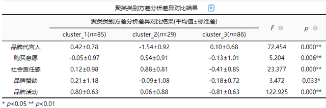 聚类类别与聚类分析项进行交叉分析,如果呈现出显著性(p<0.05),意味着聚类得到的不同类别样本,在相同指标上有明显的差异。这说明参与聚类分析的5个变量能够很好的区分类别,类间差异足够大,其中p值越小说明明类别之间的差异越大。