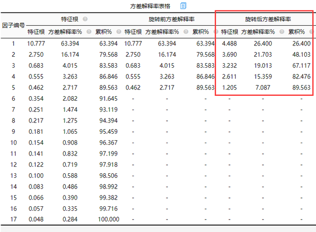 方差解释率可以说明因子包含原数据信息的多少,方差解释率越大说明因子包含的信息越多。因子分析中,主要关注旋转后的数据部分。由上图可以显示17个指标中,五个因子方差解释率分别为26.400%、21.703%、19.013%、15.359%以及7.087%,累积方差解释率由五项相加为89.563%,累积方差解释率这个值没有固定标准,一般超过60%都可以接受。特征根对于因子的提取有什么作用,以下展开来说。
