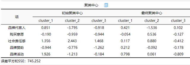 在进行Kmeans聚类分析时SPSSAU默认输出误差平方和SSE值,该值可用于测量各点与中心点的距离情况,理论上是希望越小越好,而且如果同样的数据,聚类类别越多则SSE值会越小(但聚类类别过多则不便于分析)。SSE指标可用于辅助判断聚类类别个数,建议在不同聚类类别数量情况下记录下SSE值,然后分析SSE值的减少幅度情况,如果发现比如从2个聚类到3个6类别时SSE值减少幅度明显很大,那么此时选择3个聚类类别较好。比如该案例若聚类数为2,此时SSE值为872.226,但是当聚类数为3时此时SSE值为779.077,发现SSE减少幅度较大。所以可以看出选择3个聚类类别较好。