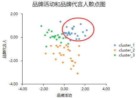 从图中可以发现各个类别之间有明显的区别,聚类的效果较好。其中发现第一个类别品牌活动与品牌代言人都比较大,建议研究时可以更加关注。