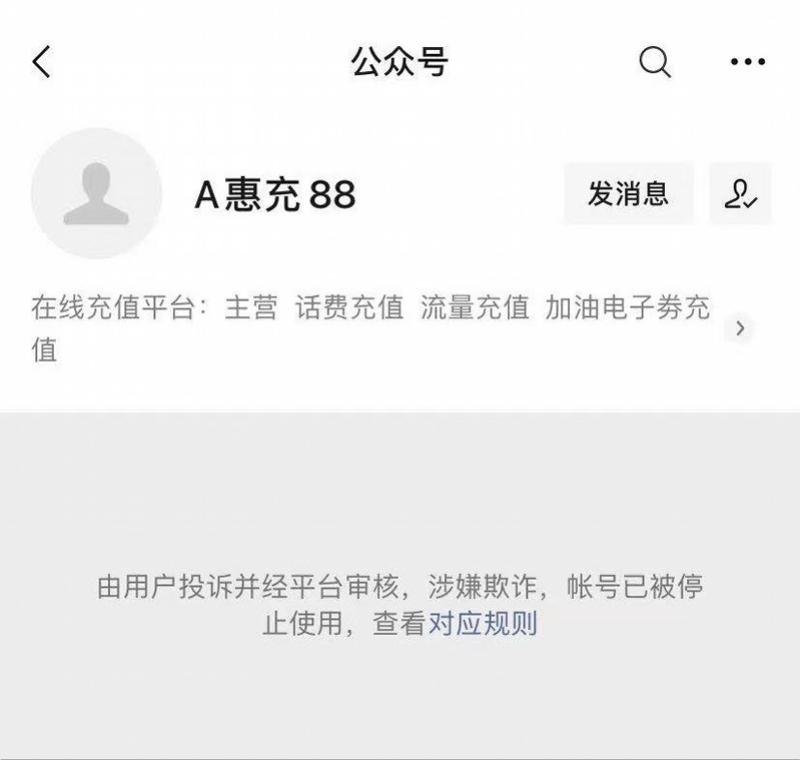日前,南都记者打开“A惠充88”微信公众号,该公众号简介为“在线充值平台:主营 话费充值 流量充值 加油电子券充值”,账号主体为广州金达利信息科技有限公司。记者发现,微信上显示,该公众号“由用户投诉并经平台审核,涉嫌欺诈,账号已被停止使用”。记者尝试拨打该公众号的客服电话,也一直为“关机或不在服务区”状态。