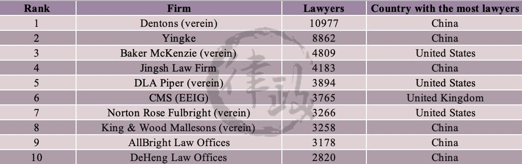 律师人数排名全球前10的律所中,中资所占据了6个席位(50%以上律师在中国),分别是大成、盈科、京师、金杜、锦天城和德恒。大成更是凭借着10977位的律师人数成为全球最大规模所,也是全球唯一一家律师人数上万的律所。