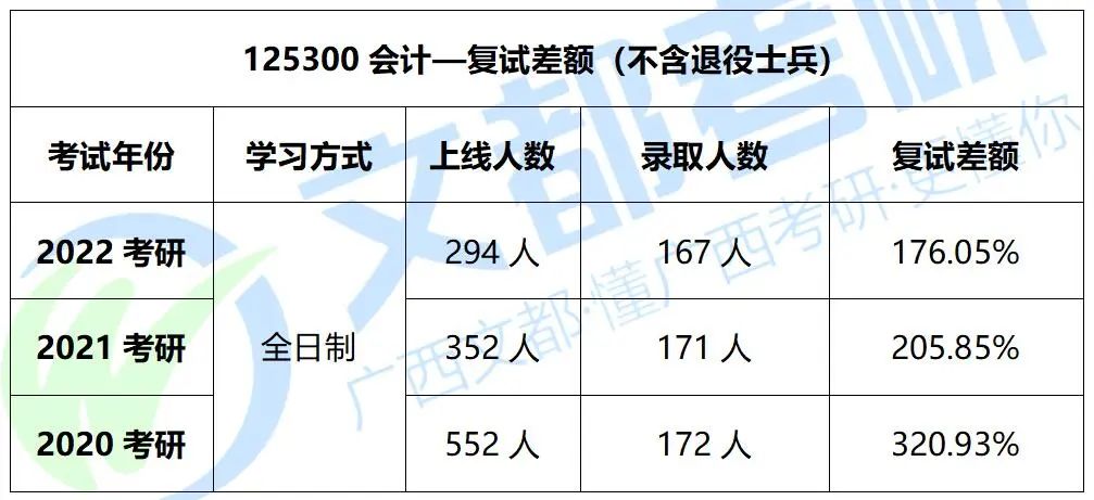 而复试差额方面,整体有降低的趋势。以2022年为例,全日制会计专硕复试差额为176.05%,而早两年的复试差额均在200%以上。