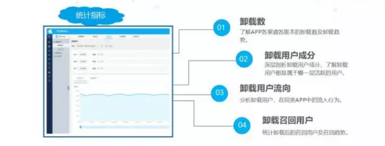 如上图所示,“个数”(个推旗下数据统计产品)就提供了多种数据分析功能,其中卸载分析,深度分析了“卸载数”背后的原由,这对于日常运营是非常实用的。