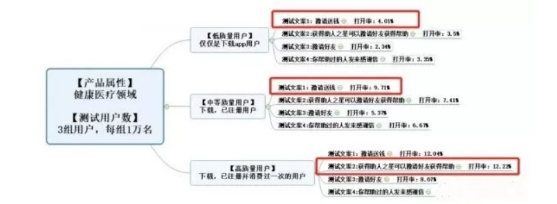 从打开率来看,“邀请送钱”的文案对于低、中质量用户效果最好;第二组“给予用户精神奖励”的文案对高质量用户效果最好。