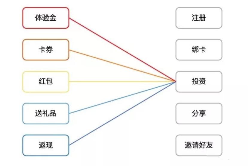 金币(积分)、卡券(抵用券、满减券、加息券)、红包、送礼品(紧俏电子产品、现金、话费)、返红包、分佣。