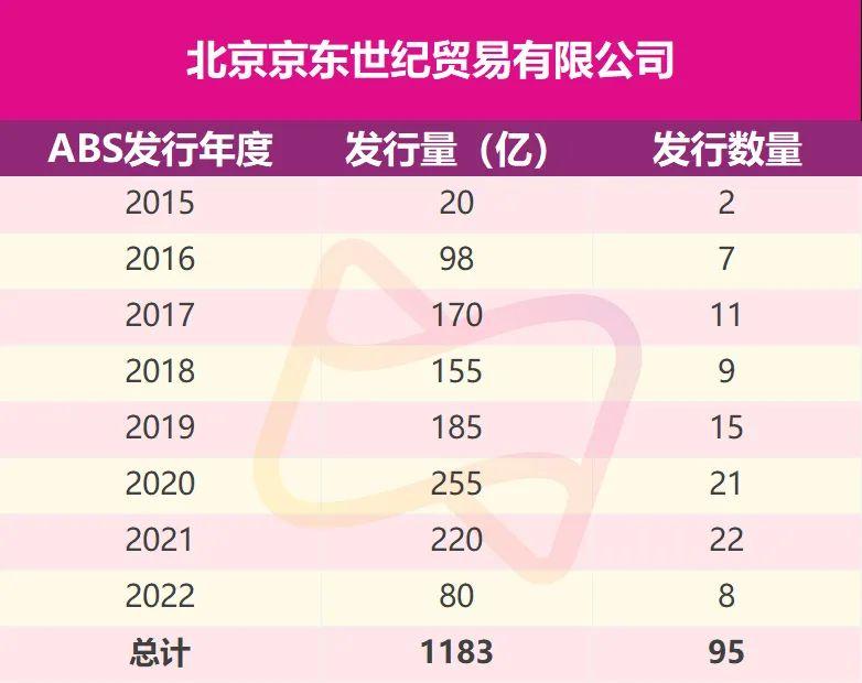 2015年至今,京东世纪贸易有限公司,累计发行个人消费金融ABS约 95单,发行总金额1183亿元,主要是京东白条应收账款债权资产支持专项计划。