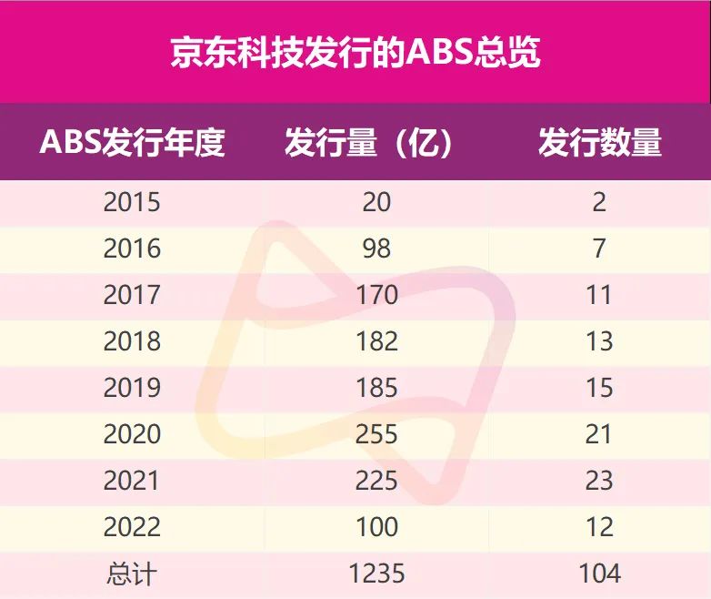 2015年至今,京东累计发行个人消费金融ABS约 104单,发行总金额1235亿元。