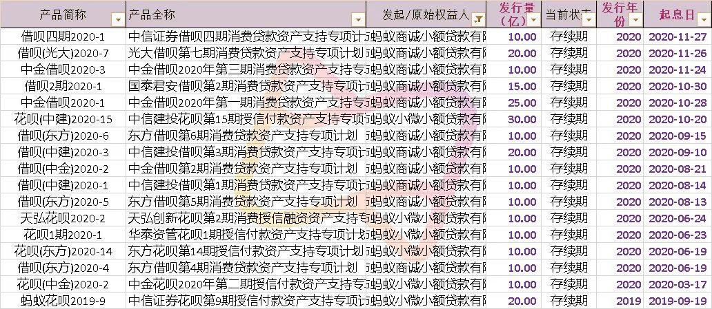 当前蚂蚁金服旗下处于存续期的ABS约17单,总金额约240亿元,最晚到期日2023年12月06日。