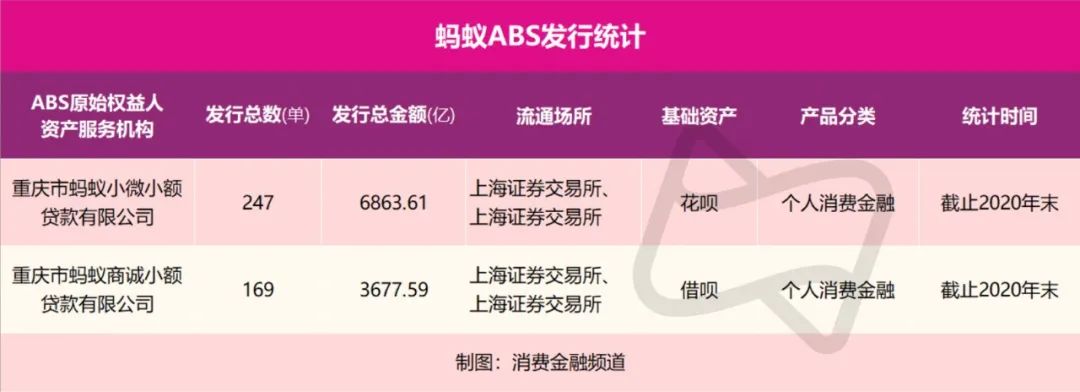 初步统计,蚂蚁商诚小贷和蚂蚁小微小贷公司作为ABS原始权益人, 2021年之前,在上海证券交易所、上海证券交易所,累计发行个人消费金融ABS约416单,发行总金额约 1.1万亿元。