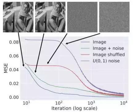 Fig. 7 重建任务的学习曲线使用:一张自然图像,加上相同的i.i.d.噪音,相同的随机打乱,白噪声。自然外观的图像收敛速度更快,而噪声被拒绝。