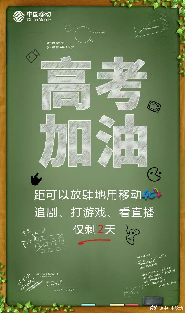 移动用“4G+放肆追剧、打游戏、看直播仅剩两天“文案来借势高考,虽然一定程度上激励着考生们,但是存在着引导孩子们在大学里放肆打游戏的意味,不太值得借鉴。