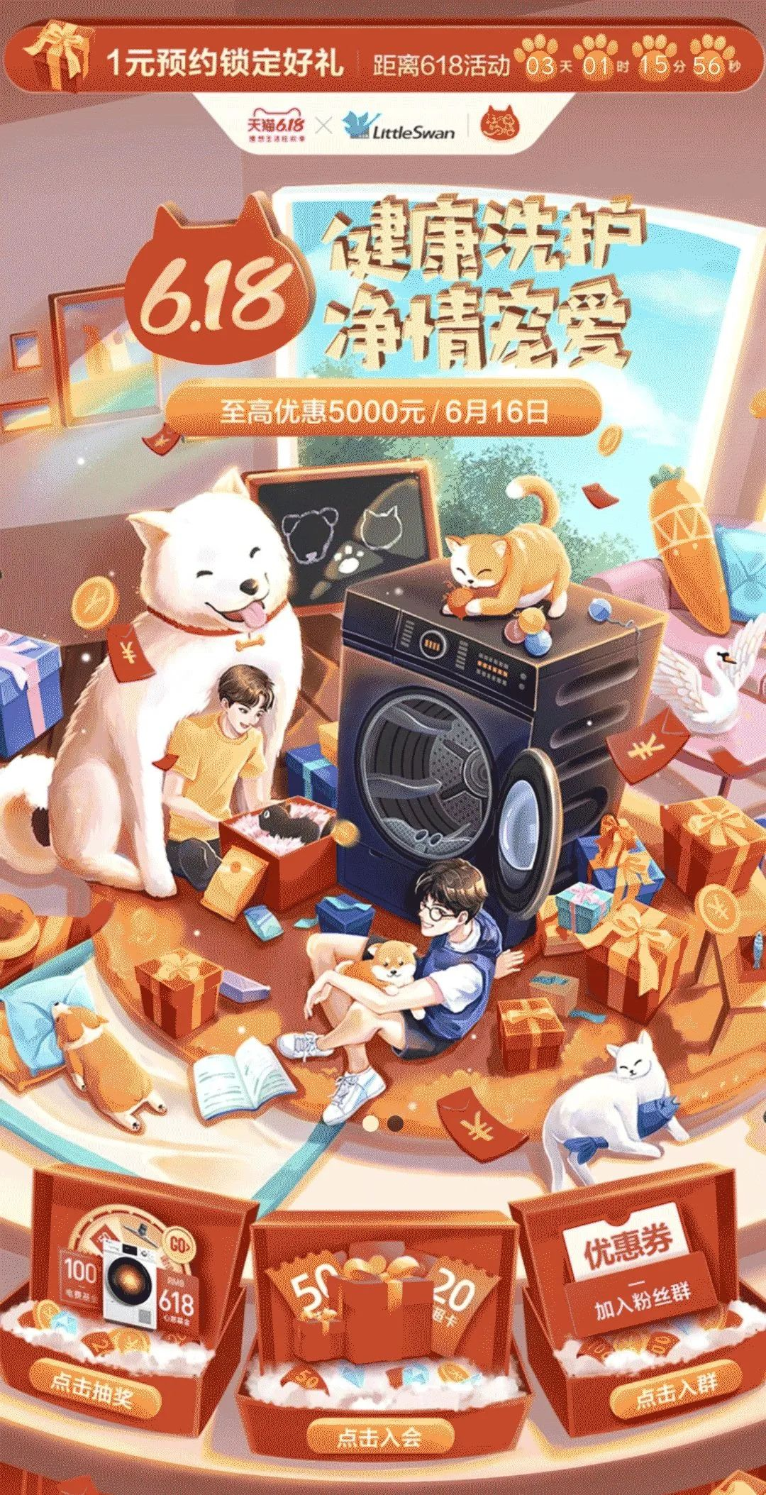 品牌小天鹅通过手绘萌系狗狗和猫咪,围绕在主推的洗衣机身边这一海报设计,可以瞬间抓住”铲屎官”们的眼球,以及满地的礼盒和优惠券也暗示着618大促期间丰厚的礼品和巨大的优惠。