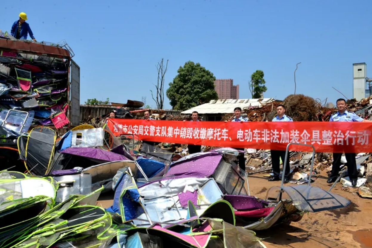 但不好的消息是,目前有很多地区都在严查这2种配件的安装,比如浙江临海、湖北黄冈、河南南阳等诸多市县都在进行严查,一旦发现有电动车加装挡风被或遮阳伞,将当街拆除,并且进行集中销毁,对于拒不改正者将给予扣车、行政拘留的处罚。