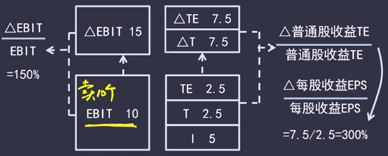 因为固定利息费用的存在,△EPS/EPS>△EBIT/EBIT
