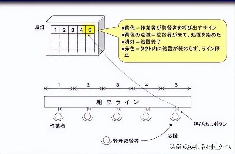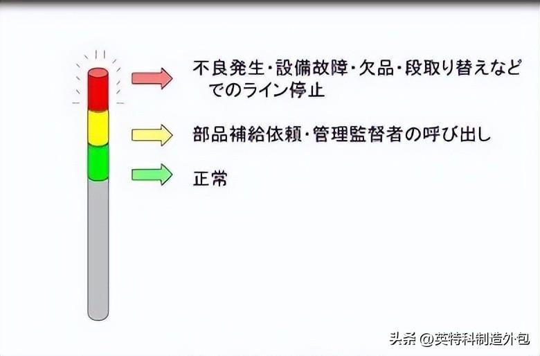 一般设置红或黄这样两种信号灯,由员工来控制,当发生零部件用完,出现不良产品及机器的故障等异常时,往往影响到生产指标的完成,这时由员工马上按下红灯的按钮,等红灯一亮,生产管理人员和厂长都要停下手中的工作,马上前往现场,予以调查处理,异常被排除以后,管理人员就可以把这个信号灯关掉,然后继续维持作业和生产。