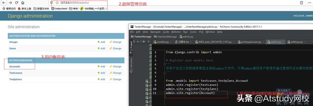 5.超级管理员关联用户自定义的数据库,在项目下的admin.py文件内注册用户自定义的数据库,注册后超级管理员admin就有权限访问该数据库。