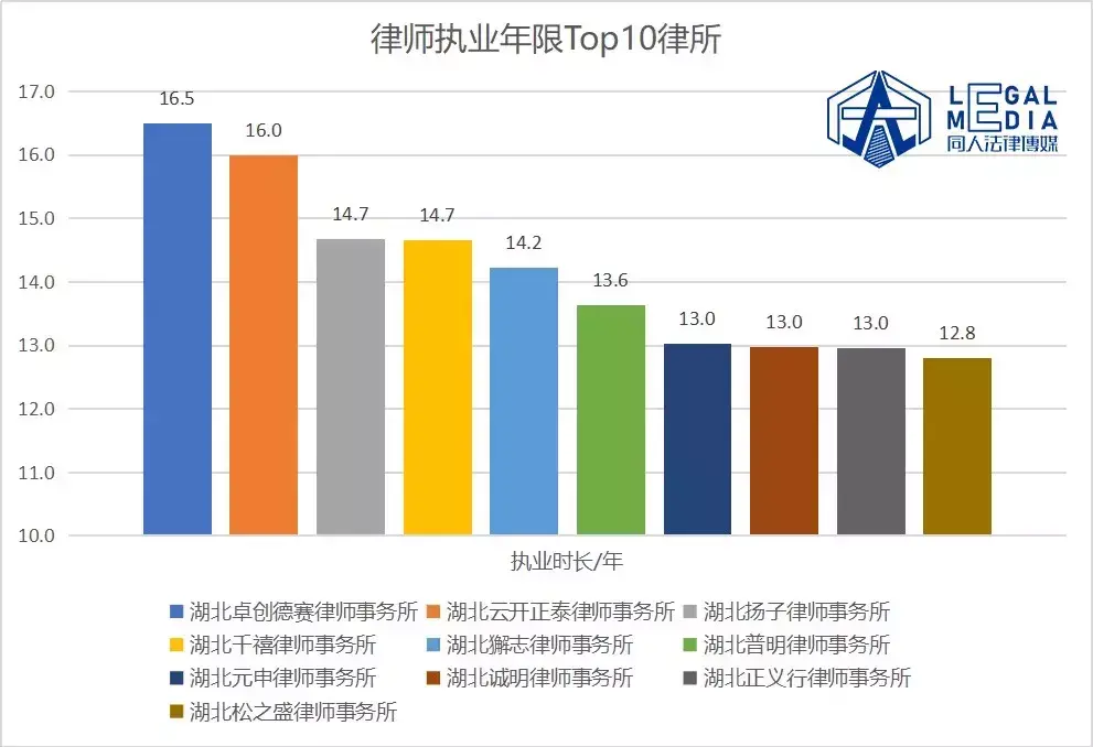 平均执业年限最长的是湖北卓创德赛律师事务所,24位律师平均执业年限16.5年。其次是湖北云开正泰律师事务所和湖北扬子律师事务所,执业年限分别是16年和14.7年。