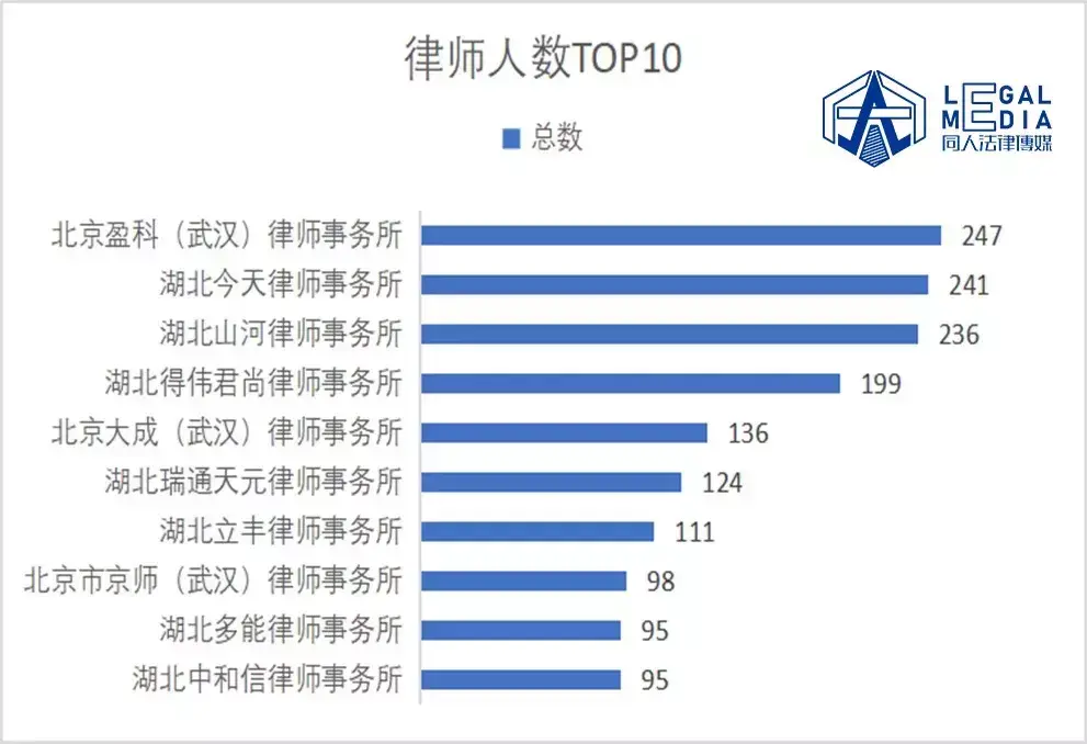其中北京盈科(武汉)律师事务所以247位律师傲视群雄,位列第一,湖北今天律师事务所以241位律师紧随其后,湖北山河律师事务所以236位律师位于第三。
