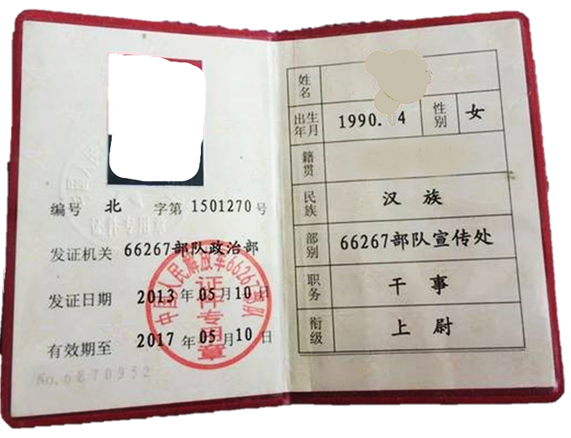 内页左侧由发证机关统一编写,包括:照片、编号、发证机关、发证日期、有效期五个信息部分。其中编号在全军范内是统一的,因此,对军官证的识别也是对军官证编号的识别。军官证编号格式为一一编号+“代字”+字第+“编号”+号,共6个汉字7个阿拉伯数字。