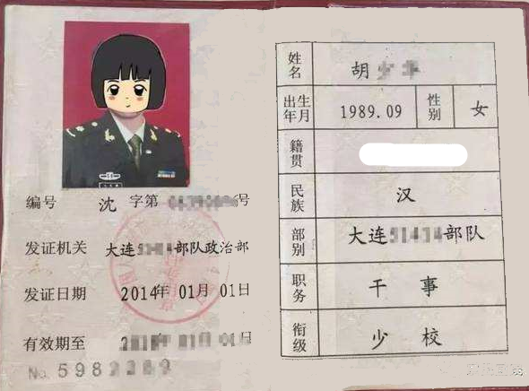 例如:编号沈字第0951053号。编号中的“代字”是大军区级的代号,用汉字表示,共十个分别为“军”、“空”、“海”、“北”、“沈”、“兰”、“济”、“南”、“广”、“成”。这十个汉字分别代表军委和总部,海军,空军,北京、沈阳、兰州、济南、南京、广州、成都七个军区。“编号”部分用阿拉伯数字共十个,分别为0至9这十个阿拉伯数字。“编号”的前1~2位是军级单位编号,3~4位是师级单位编号,前四位由总政治部统一规定填写,后三位由千部所属单位政治部自行编写。军官证内氯右侧是反映干部自然情况的简历,分为姓名、出生年月、性别、籍贯民族、部别、职务、衔级等7个部分,由政治部门填写。