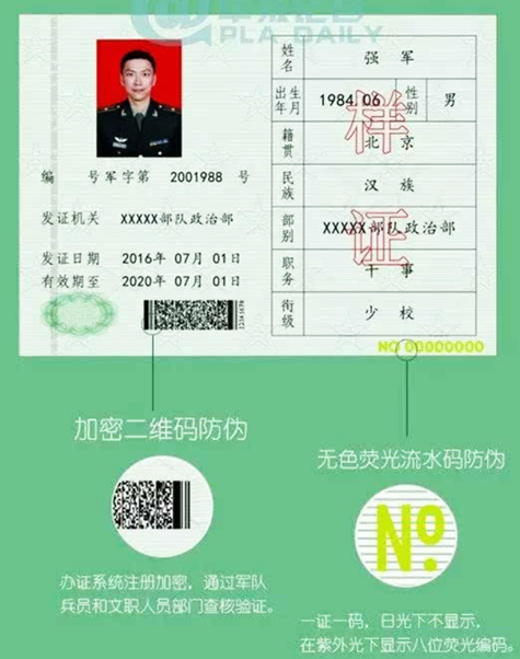 新版军官证统一采取”军”冠字头加7位数字的形式编码,不管职务岗位如何调整变换,号码始终不变。防伪程度里程碑式提高,具有浮雕、定位水印、安全线、解锁、缩微文字、无色荧光、加密二维码等多项防伪技术。
