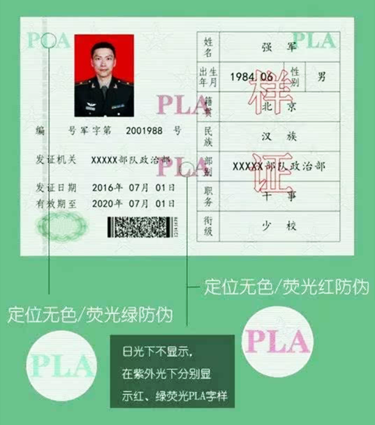 在荧光照射下,2016式军官证内页上出现“PLA”字样防伪标识,如下图。
