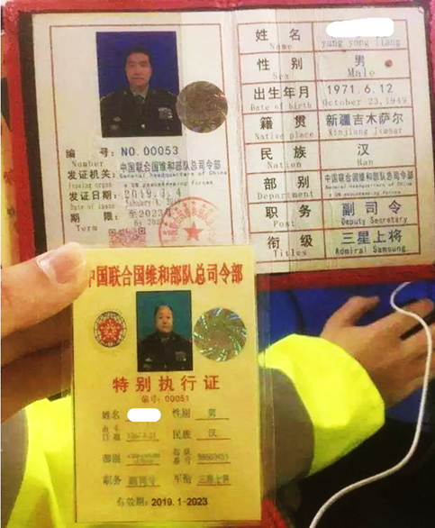 最搞笑的是这位,不但用老版的军官证,还自己整了个《联合国维和部队总司令部特别执行证》,更过分的是为了提高真实性竟然搞出个中英双语证件,可偏偏翻译的时候把“三星上将”的“三星”翻译成“sumsung”,确实不是一般人!