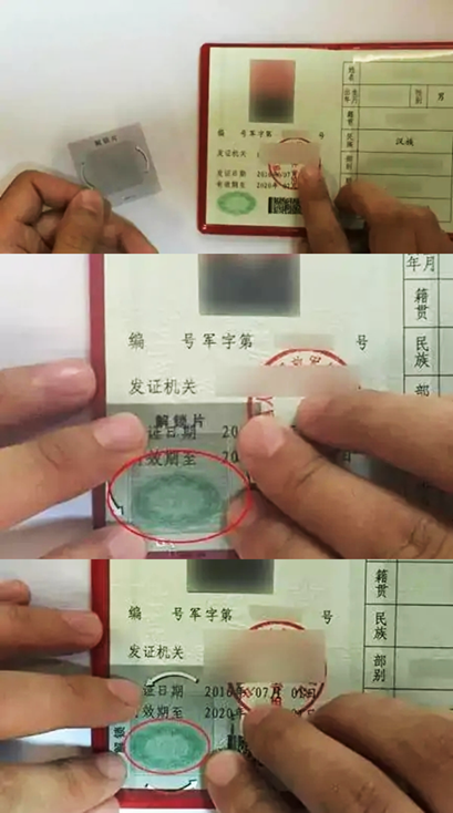 2.将解锁片解锁区覆盖证件识别区,透过解锁片看到绿色“军官证”字样