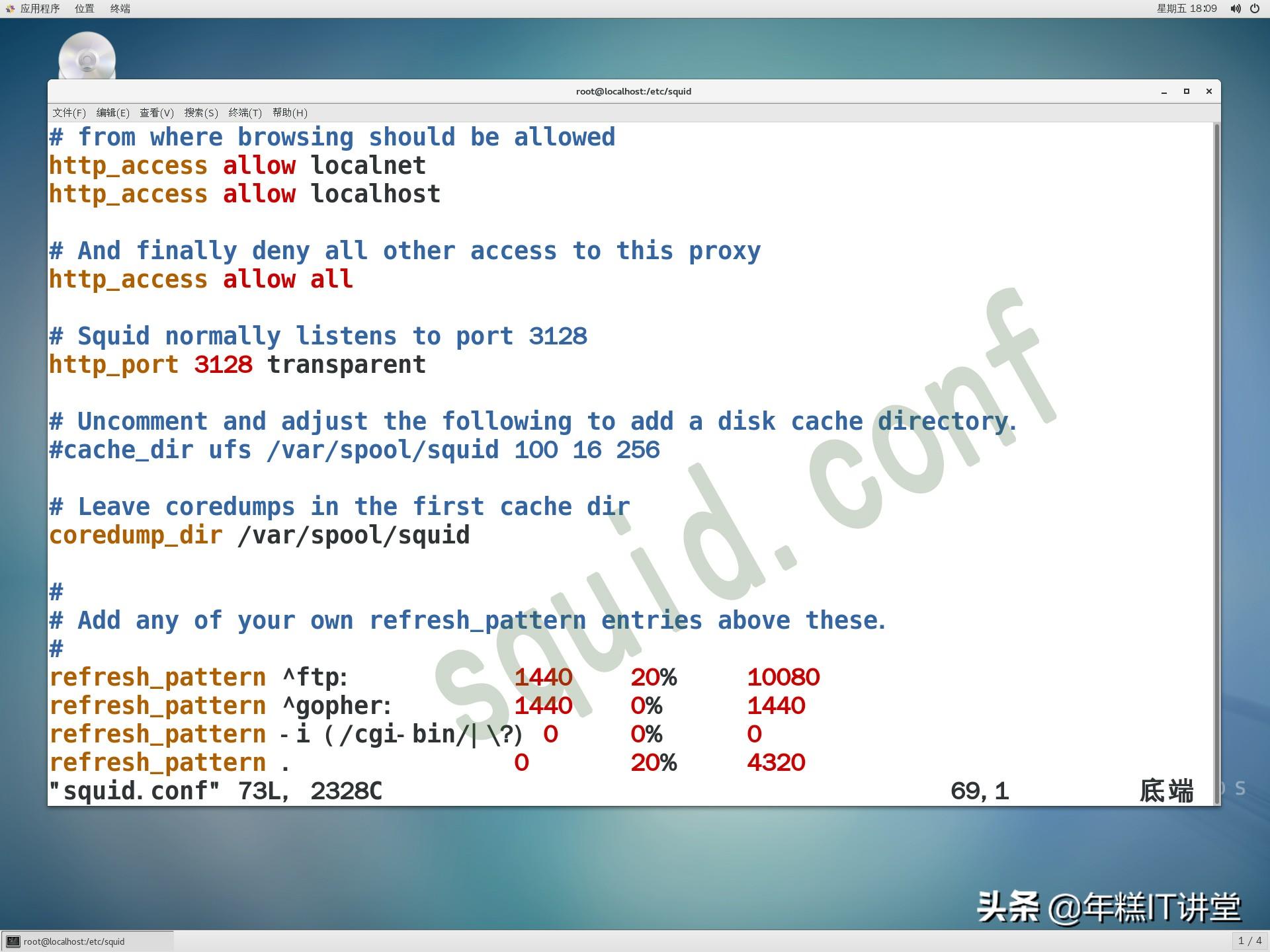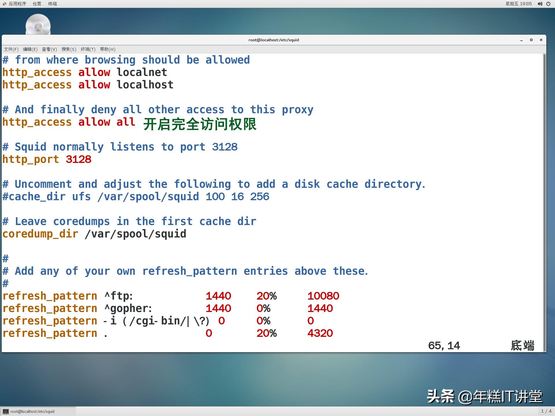 图3描述了Squid服务器的主配置文件,/etc/squid/squid.conf,这里我只修改了一个地方,http_access deny all改为http_access allow all,基于安全原因,Squid代理服务器默认不代理任何客户端,通过以上语句的修改,Squid可以代理所有客户端。