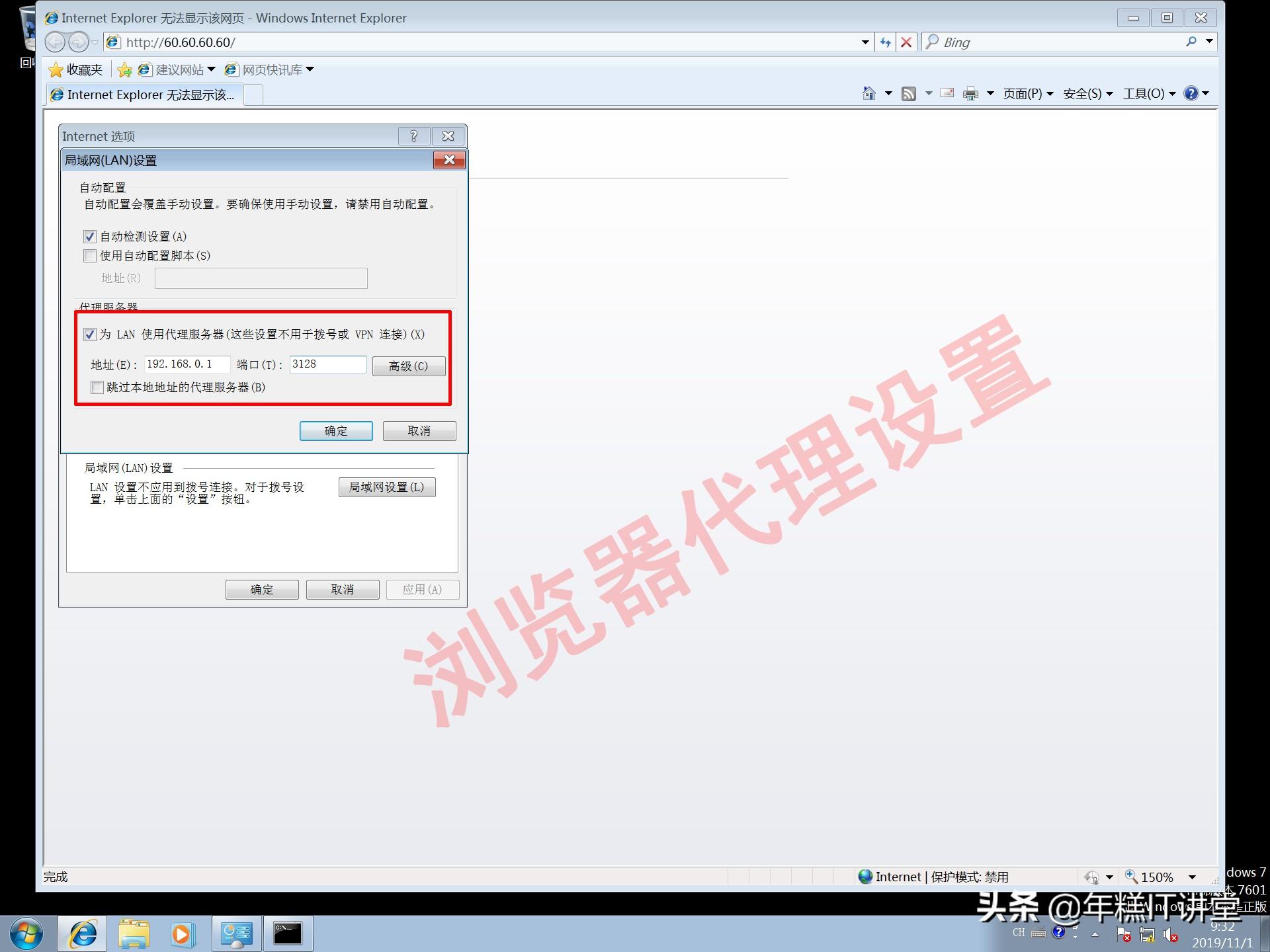 图5描述了客户端浏览器的配置过程,本案例以IE浏览器为例,指定代理服务器的内网地址(注意必须是内网地址,因为只有这个地址才能被客户端访问到),以及端口(Squid默认的伺服端口是tcp3128)。