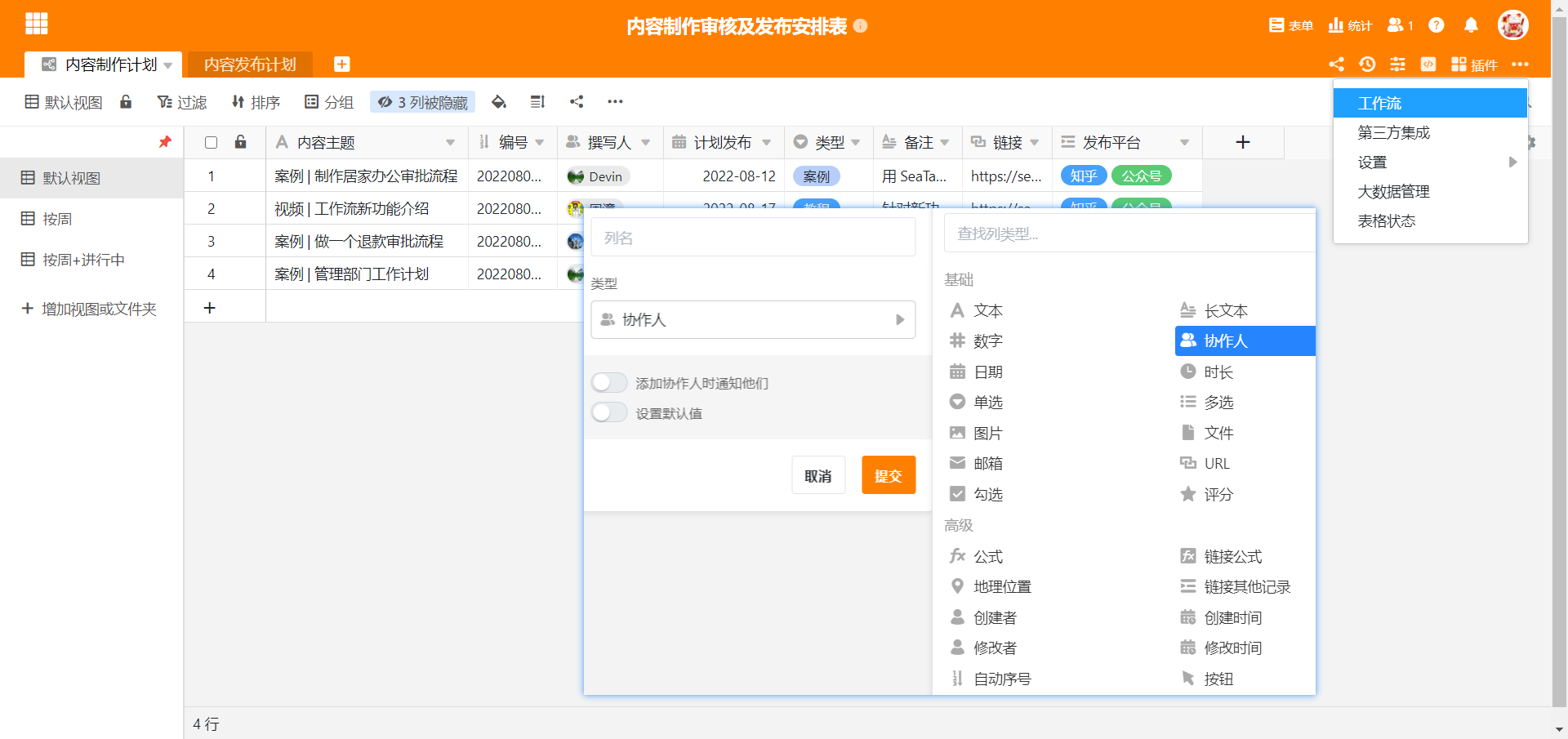 接下来,在「内容制作计划」子表上增加工作流,实现内容安排、审核、发布的自动流转流程。
