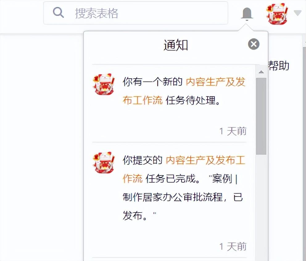 最后由“发布稿件”节点负责人发布完内容,点击提交后,自动流转至“已结束”节点,同时流程结束通知自动发至任务的发起人,完成流程闭环。