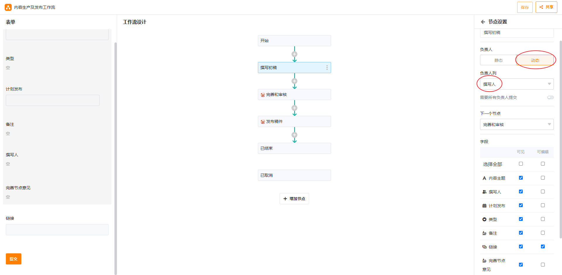 不同的内容需要由不同的人去撰写,因此该节点选择动态负责人,并选择了子表中已有的“撰写人”列。(负责人增加任务时,在“撰写人”列选择由谁撰写)