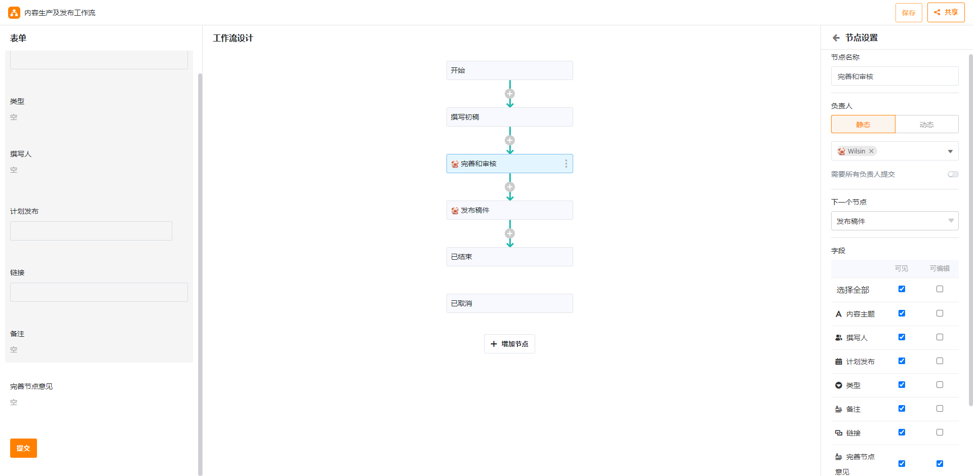 与此同时,我们还需要根据实际情况设置流程,即每个节点名称、负责人、字段读写权限等(每一个节点就是任务的一个状态)。最后保存即可。例如本案例中设置了增加任务后→撰写初稿→完善和审核→发布稿件→结束。