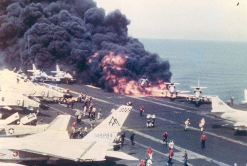 刹那间,福莱斯特号航母上光火冲天,浓烟滚滚,有许多飞行员来不及逃离,死在驾驶舱里。