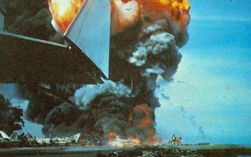 就在这时,一架飞机油箱突然被击中,泄露的燃油被明火点燃,蔓延到航母各处,又引爆了飞机下悬挂的航空炸弹。
