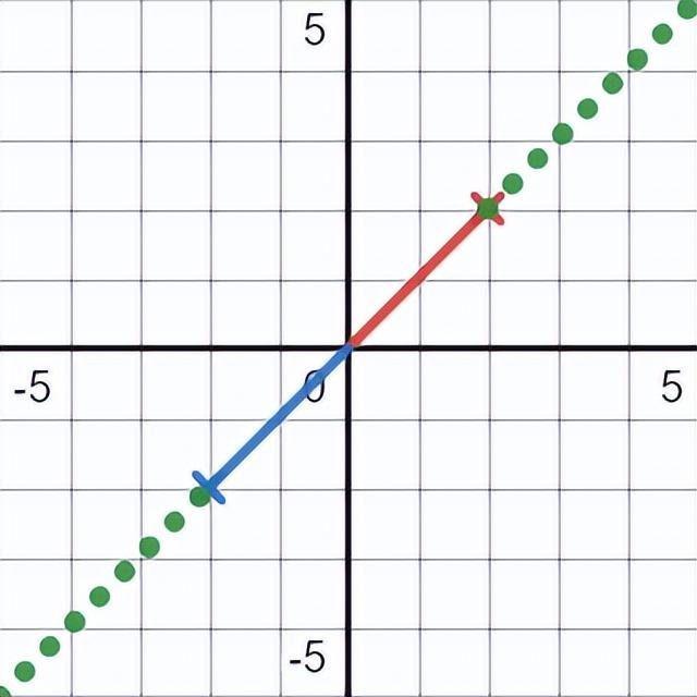 第一组向量(红色和蓝色)不是线性独立的,因为它们在同一条线上;它们其中任意一个向量乘以-1就会得到另一个向量。