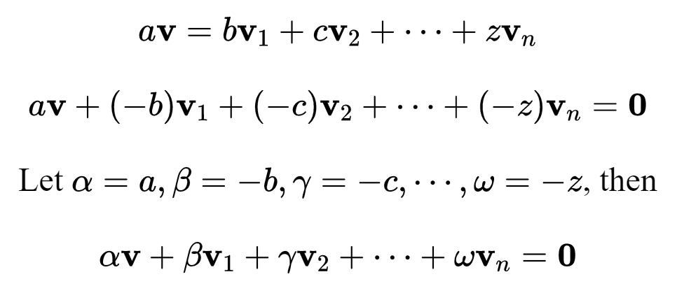这个定义实际上和我们的定义是一样的。如果向量集合中的向量v可以写成其他向量的线性组合,则向量集合{v_1,v_2,…,v_n}是线性相关的。将其化成方程形式,v = (bv_1+ cv_2+…+ zv_n),取标量值b, c,…,z。然后在v前面加上标量a(a可以等于1),得到我们的主要方程: