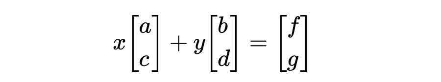 xc_1+ yc_2之和为A列的线性组合;这是一个“加权和”,当我们把矩阵和向量相乘时就会得到,它是对高中教的矩阵乘法“行列法”的另一种解释。