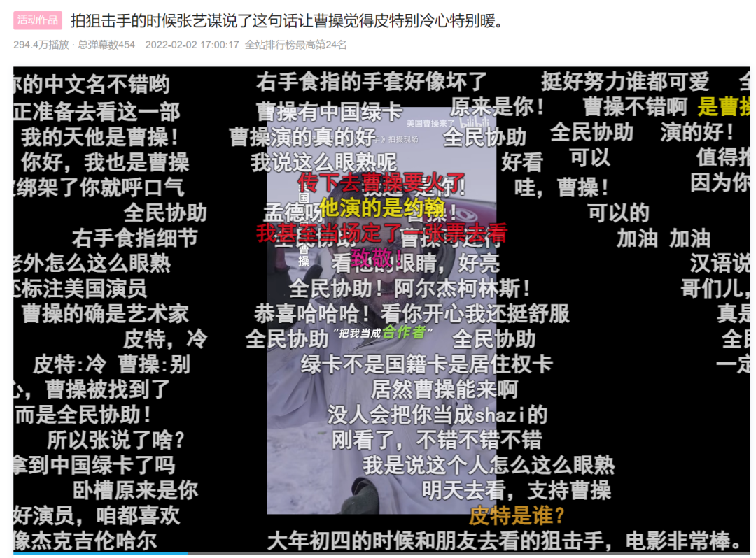 比如春节档口碑最高的影片《狙击手》,其演员曹操本身就是B站的一位UP主。其发布的与《狙击手》有关的视频获得了280多万的播放量,而在此之前,他日常更新的视频大多只有10万播放量左右。弹幕和评论中不乏因为曹操而萌生去影院观影想法的用户。
