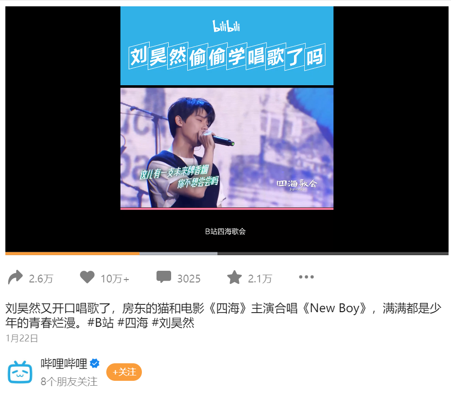 据官方数据显示,“四海歌会”直播观看人气值超120万。“刘昊然唱歌”作为一个出圈点,也将热度从站内延伸到了站外,当晚#刘昊然是不是偷偷报了声乐班#成功登上了微博热搜。B站官方视频号发布歌会相关视频《刘昊然偷偷学唱歌了吗》,点赞迅速达到10万+。
