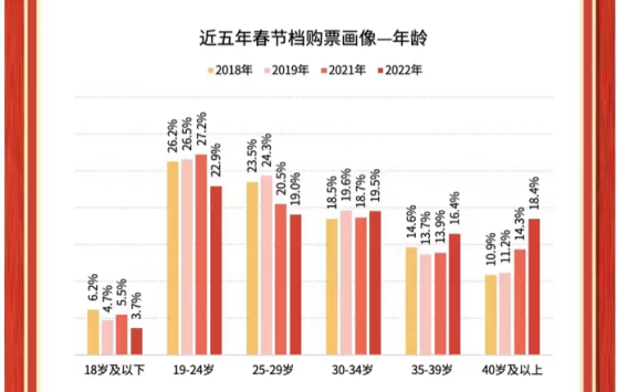 电影永远需要争取年轻人,培养年轻人的消费习惯和消费理念,对于中国电影产业的现在和未来都很重要。当下Z世代和00后们的社交娱乐方式在变得更加多样,剧本杀、密室逃脱、线上观影......他们不再是不得不选择电影院的一代。据猫眼研究院《2022春节档数据洞察》统计的近五年春节档购票年龄画像显示,近几年来春节档35岁以上人群占比提升,而30岁以下人群占比逐渐减少。