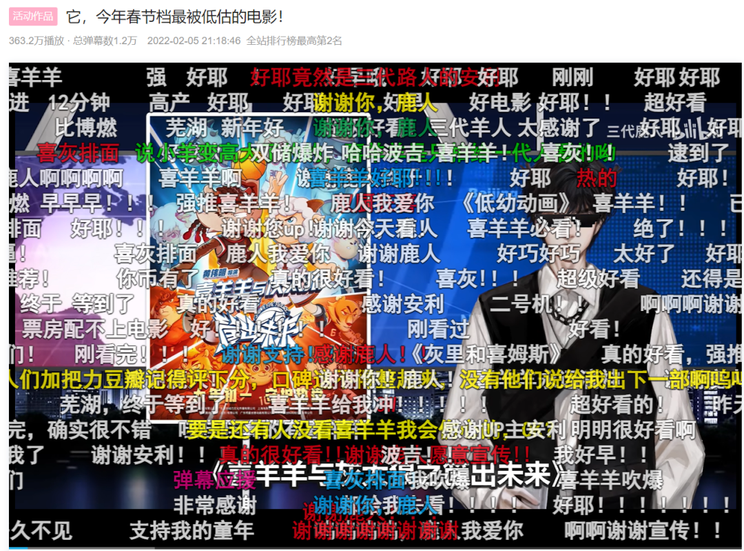例如UP主“三代鹿人”发布的安利影片《喜羊羊与灰太狼之筐出未来》(以下简称《筐出未来》)的视频,收获了超300万播放量,一度排名全站热门第二。值得注意的是,其视频发布时间为2月5日晚,而《筐出未来》单日票房逆袭的时间节点恰巧从2月6日开始,某种程度上与大众观影情绪转折点相暗合。