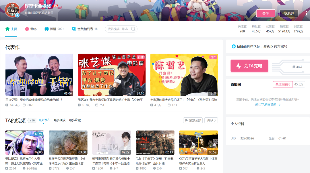 首先是官方渠道,这也是一般平台给到的最直接的宣发帮助。B站开设了“哔斯卡金像奖”“哔哩哔哩影视娱”等官方账号,一方面给参与营销的片方提供了发布物料的统一出口,另一方面也打造了如《bilibili 星访问》《UP!哔聊电影室》等特色自制栏目。